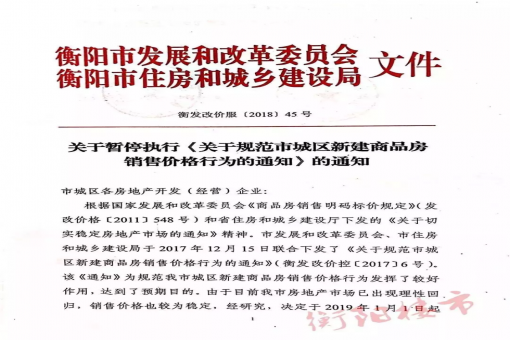 繼山東菏澤頂著壓力解除限售后,湖南衡陽(yáng)大膽宣布取消限價(jià)。 衡陽(yáng)樓市微信公眾號(hào)26日公布衡陽(yáng)發(fā)改委和住建局聯(lián)合下發(fā)的一份文件,自2019年1月1日起暫停執(zhí)行此前……