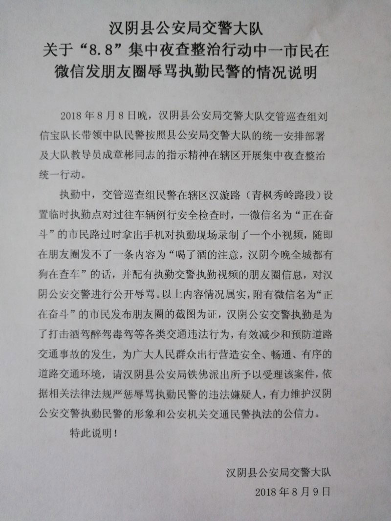 8月9日上午,辦案民警即將散布辱警信息的郭某全抓獲。經(jīng)查,8月8日下午19時許,郭某全步行經(jīng)過漢陰縣城關鎮(zhèn)青楓秀嶺路口與漢漩路口交匯處時,漢陰縣公安局交警大隊民警正在集中開展酒駕夜查整治行動。郭某全出于對交警的不滿,使用微信昵稱為“正在奮斗”社交媒體,發(fā)布了一條內(nèi)容為:“喝了酒的注意,漢陰今晚全城都有狗查車”的朋友圈,并配發(fā)交警現(xiàn)場查車視頻。郭某全的行為違反了《中華人民共和國治安管理處罰法》第二十六條第(四)項之規(guī)定,已經(jīng)構成尋釁滋事的違法行為,被漢陰縣公安局依法裁決七日行政拘留處罰。