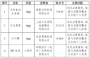 三、貝利自動點擊器、萬達普惠等4款App違反必要原則,收集與其提供的服務無關的個人信息(詳見下表)。