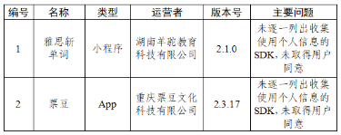 二、雅思斬單詞、票豆等2款App未逐一列出收集使用個人信息的SDK,未取得用戶同意(詳見下表)。