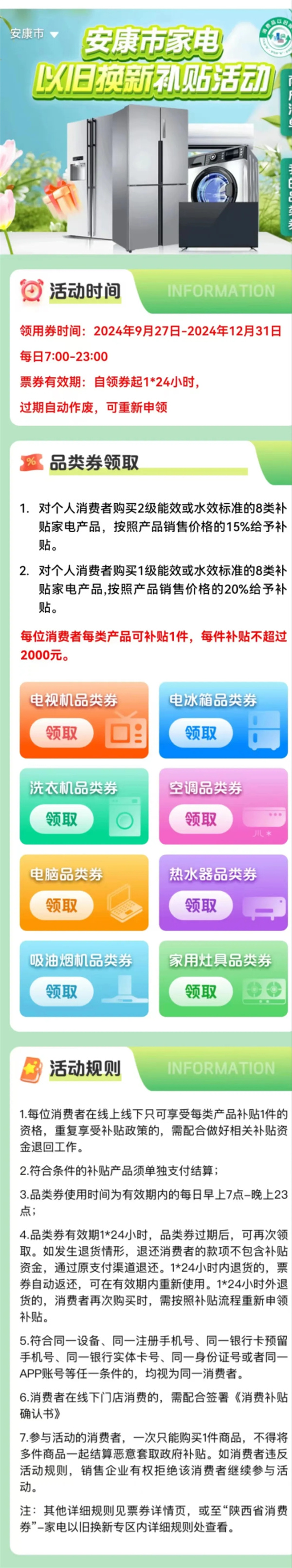 ※進(jìn)入“陜西省家電以舊換新專區(qū)-安康品類券”頁面。