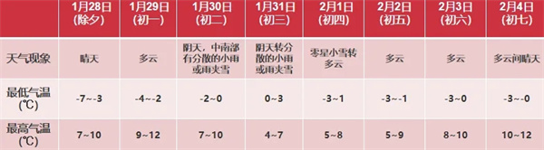 據(jù)悉,春節(jié)前期(除夕到初一),我市以晴天到多云天氣為主;初二到初四我市大部陰天,中南部有分散的小雨或雨夾雪,高山地區(qū)有間歇性小雪;初五到初七天氣轉(zhuǎn)好。預(yù)計(jì)春節(jié)期間川道地區(qū):-3~12℃,高山地區(qū):-7~9℃,最低氣溫整體較低:川道地區(qū)-3~4℃,秦巴山區(qū)-7~2℃。