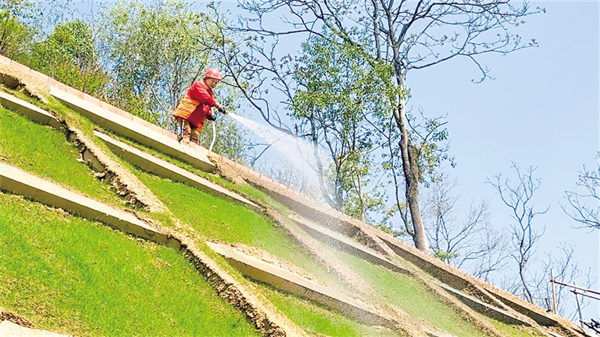 在“安康湖”博物館段南側(cè)生態(tài)修復(fù)工程現(xiàn)場,記者看到,這面曾經(jīng)因風(fēng)化裸露存在安全隱患的山體,如今通過噴漿、格構(gòu)梁護坡再覆綠的“地質(zhì)縫合術(shù)”重獲新生。