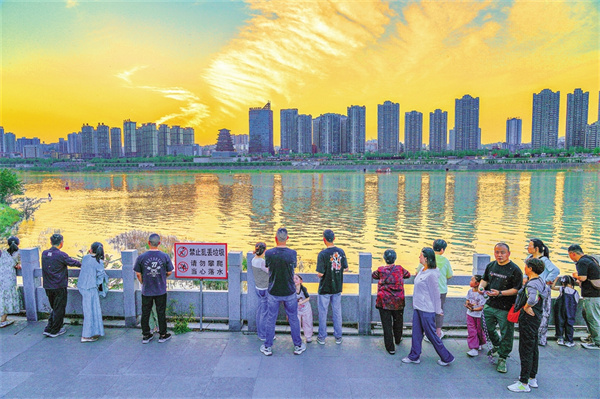 5月2日,天邊的云彩被夕陽(yáng)染成了暖黃色,與江水的波光相互輝映,構(gòu)成了一幅絕美的畫卷。圖為安康城區(qū)濱江公園的步道上,眾多游客在享受愜意的時(shí)光。皮勇維 攝
