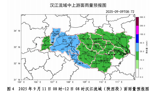 預(yù)計10日08時-11日08時漢江流域(陜西段)大部面雨量0.1~10毫米,玉帶河、酉水河、子午河、任河流域面雨量10-25毫米,褒河流域面雨量25-50毫米(圖3);11日08時-12日08時漢江流域(陜西段)褒河、酉水河、子午河、任河面雨量25~50毫米,其余中小河流流域面雨量10~25毫米(圖4);12日08時-13日08時漢江流域(陜西段)任河、堵河流域面雨量達(dá)10~25毫米,其余中小河流流域面雨量0.1~10毫米(圖5)。