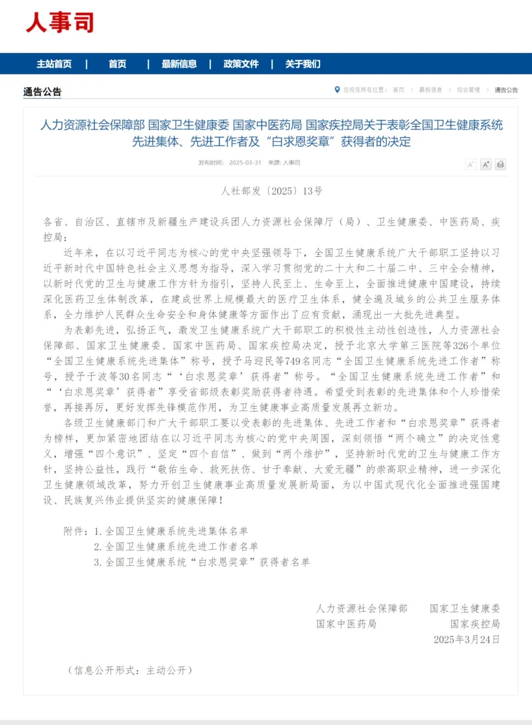 近日,人力資源社會(huì)保障部、 國(guó)家衛(wèi)生健康委等四部委發(fā)布關(guān)于表彰全國(guó)衛(wèi)生健康系統(tǒng)先進(jìn)集體、先進(jìn)工作者及“白求恩獎(jiǎng)?wù)?rdquo;獲得者的決定,我市1個(gè)集體、1人分別獲得全國(guó)衛(wèi)生健康系統(tǒng)先進(jìn)集體、全國(guó)衛(wèi)生健康系統(tǒng)先進(jìn)工作者榮譽(yù)稱(chēng)號(hào)。