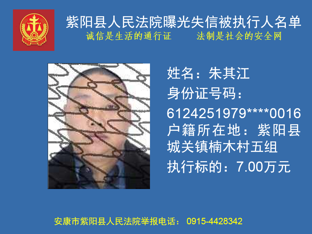 被執(zhí)行人朱其江,你因不履行(2017)陜0924民初241號(hào)民事判決書(shū)確定的義務(wù),已被紫陽(yáng)縣人民法院納入失信被執(zhí)行人名單庫(kù)依法進(jìn)行信用懲戒。信用懲戒范圍包括但不限于以下措施: