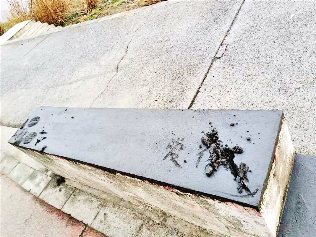 清晨跑步途徑江邊步道,一位施工的師傅和江灘公園保潔員說:“在擋護墩上刻字,太不文明了!弊叩礁埃胖朗亲蛱煜挛鐒倓偸┕そY束的擋護墩,還未完全凝固的……