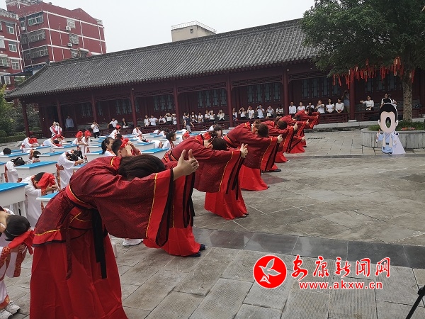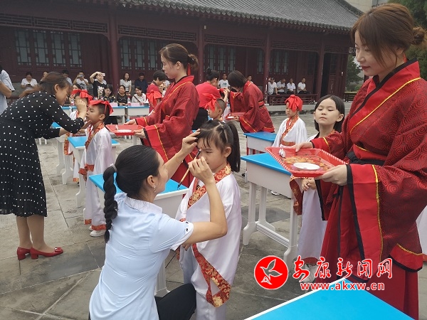據(jù)了解,“開筆禮”是中國古代人生“四大禮”之首,是蒙童入學(xué)階段極為重要的儀式。“開筆禮”儀式主要分成六項(xiàng)內(nèi)容,每一項(xiàng)內(nèi)容承載著特定的教育目的。“正衣冠”要求學(xué)子們養(yǎng)成干凈整潔的生活習(xí)慣;“感恩鞠躬”讓學(xué)子向師長行揖禮,謝師恩、謝親恩,并為師者和長輩奉茶,讓他們從小懂得孝親尊師的道理;“凈手凈心”讓學(xué)子們從此靜心讀書,心無旁騖;“朱砂啟智”,表達(dá)了師長對(duì)學(xué)子們的美好祝愿,希望他們心明眼亮,聰慧過人;“擊鼓明志”讓學(xué)子們樹立遠(yuǎn)大的理想與目標(biāo);“開筆啟蒙”書寫“人”字,學(xué)會(huì)做人的道理。蒙童通過親身經(jīng)歷這種莊嚴(yán)古樸的儀式,實(shí)現(xiàn)從蒙童到學(xué)生的心理過渡。