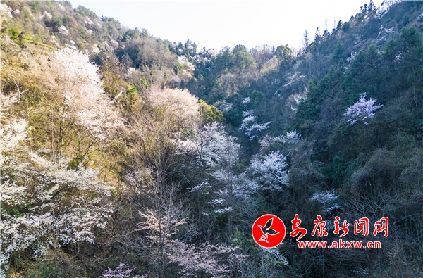 本網(wǎng)訊(記者 李俊 實(shí)習(xí)記者 卜昊天)近日,漢濱區(qū)晏壩鎮(zhèn)漫山的野生櫻桃花在和煦的春風(fēng)中競(jìng)相盛開。遠(yuǎn)眺山林,從山腳到山頂次第綻放,山澗幽谷處處粉白,民居藏于其中,宛若世外桃源,起伏的山脈被一簇簇壓滿整個(gè)枝頭的櫻桃花所覆蓋。