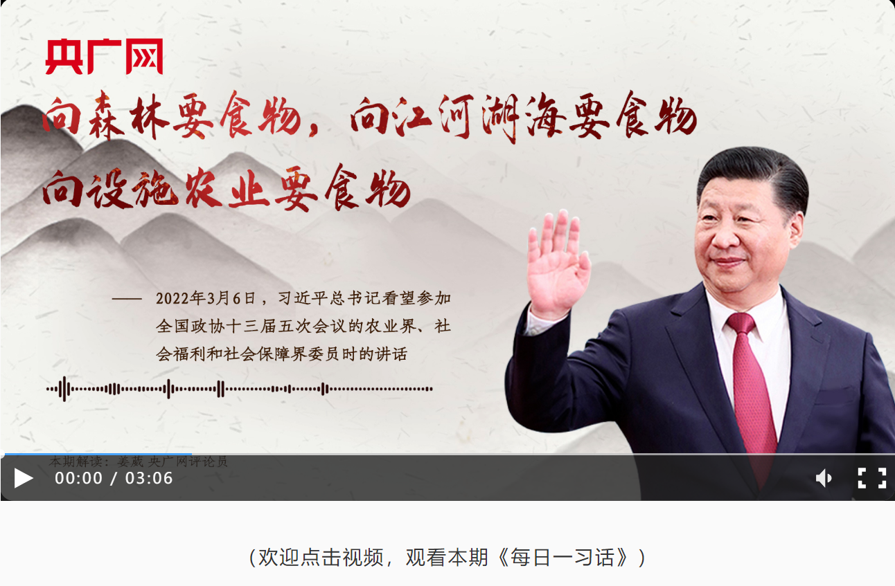 習(xí)近平:要向森林要食物,向江河湖海要食物,向設(shè)施農(nóng)業(yè)要食物,同時要從傳統(tǒng)農(nóng)作物和畜禽資源向更豐富的生物資源拓展,發(fā)展生物科技、生物產(chǎn)業(yè),向植物動物微生物要熱量、要蛋白。