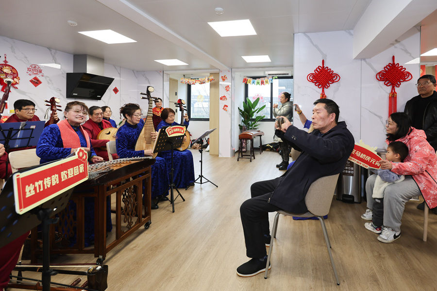 民樂(lè)隊(duì)在上海市閔行區(qū)新時(shí)代城市建設(shè)者管理者之家演奏(2024年2月23日攝)。新華社記者王翔 攝