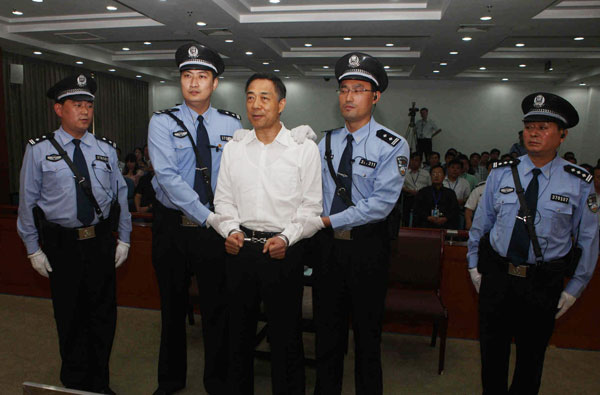9月22日,薄熙來(lái)案件在濟(jì)南中院宣判。圖為宣判結(jié)束后,薄熙來(lái)被帶上手銬。