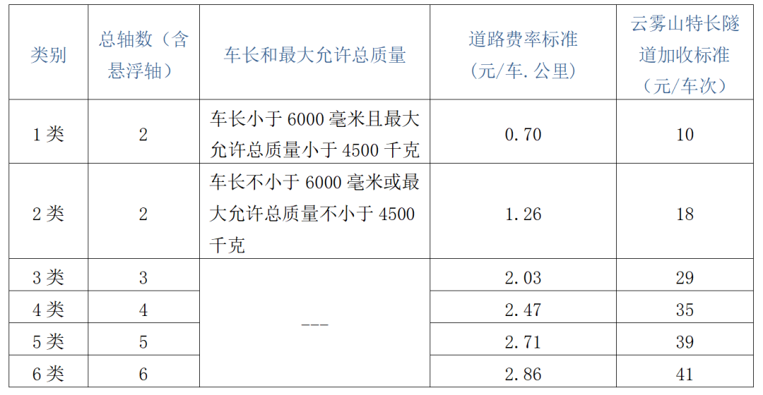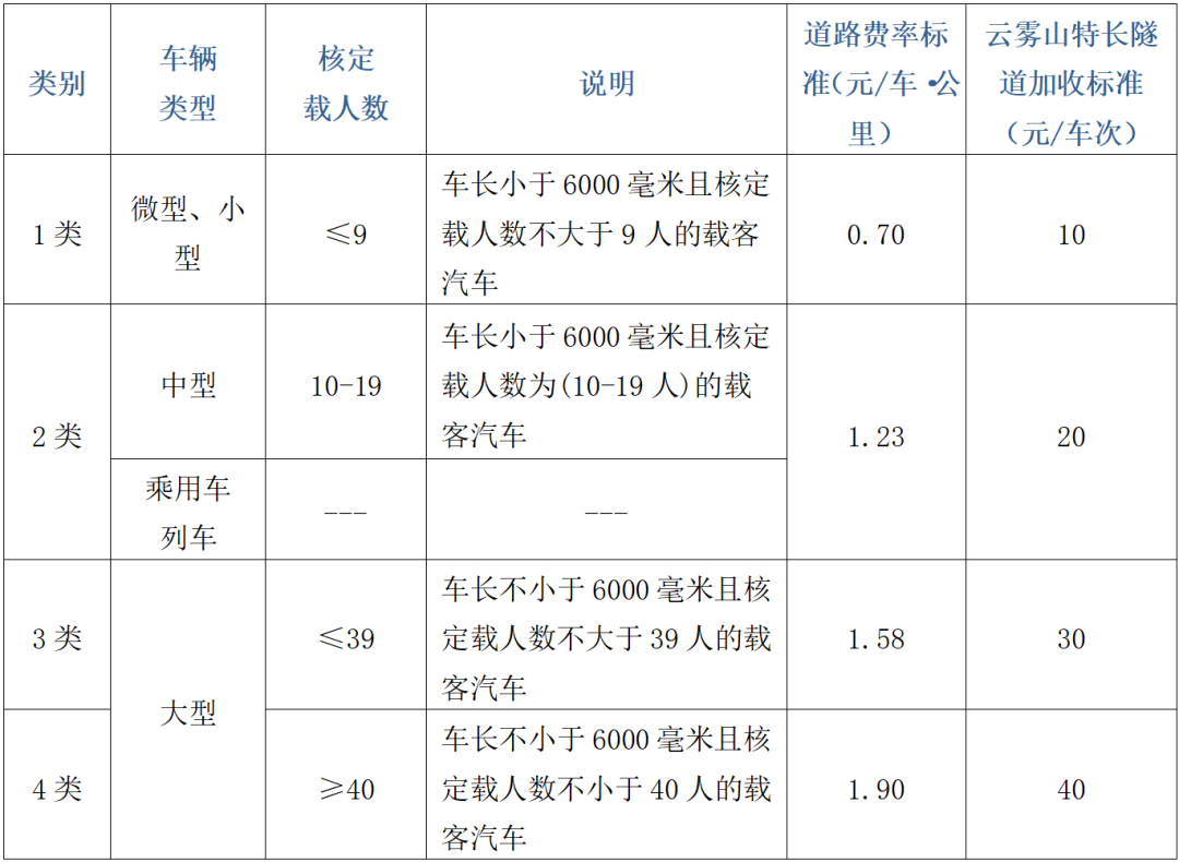 除國(guó)家規(guī)定免繳通行費(fèi)的車(chē)輛外,其他車(chē)輛均須按照《收費(fèi)公路車(chē)輛通行費(fèi)車(chē)型分類(lèi)》(JT/T489-2019)及下列收費(fèi)標(biāo)準(zhǔn)繳納車(chē)輛通行費(fèi)。