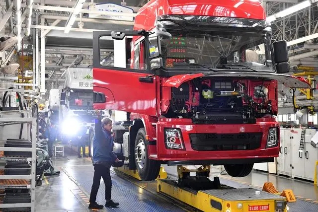 工業(yè)機(jī)器人揮舞長(zhǎng)臂,工人在生產(chǎn)線上緊張忙碌。在位于西安經(jīng)開(kāi)區(qū)涇渭新城的陜汽控股集團(tuán),總裝車(chē)間正馬力全開(kāi),每6分鐘就有一輛整車(chē)從這里下線。