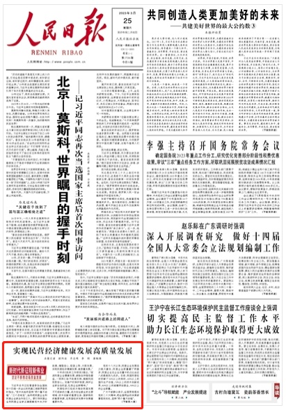 3月25日,《人民日?qǐng)?bào)》頭版刊發(fā)文章《實(shí)現(xiàn)民營(yíng)經(jīng)濟(jì)健康發(fā)展高質(zhì)量發(fā)展(新時(shí)代新征程新偉業(yè)·堅(jiān)定不移推動(dòng)高質(zhì)量發(fā)展)》,其中聚焦陜西民營(yíng)經(jīng)濟(jì)發(fā)展。