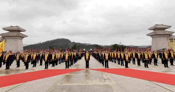 清明的橋山,古柏蒼蒼,沮水泱泱。典前序禮上,序禮執(zhí)事宣誦祝文,來自全國部分省、自治區(qū)、直轄市,香港、澳門特別行政區(qū)和臺灣地區(qū)以及海外的與祭嘉賓,在儀仗隊的引領下,至誠至虔,景行軒轅橋、龍尾道,至軒轅廟山門。隨后,各方代表在指定區(qū)域列隊肅立。橋山祭祀廣場上,象征中華民族大團結的56面龍旗迎風飄揚,現場氣氛莊嚴、肅穆。