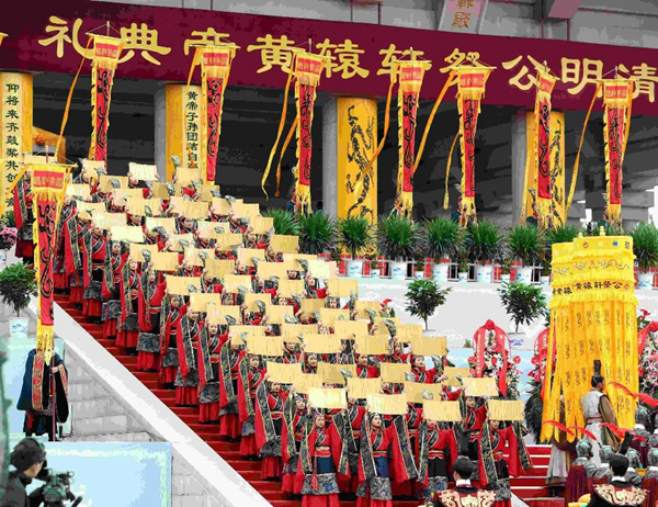 鼓聲雄渾,鐘鳴悠遠。擊響的34通鼓聲,象征著全國34個省、自治區(qū)、直轄市,香港、澳門特別行政區(qū)和臺灣地區(qū),以及海內外中華兒女崇敬初祖的共同心聲;9響鐘鳴,代表了中華民族傳統禮儀的最高禮數,表達全體炎黃子孫對人文初祖軒轅黃帝的無限景仰和無比感恩!饵S帝頌》響徹全場,拉開典禮大幕。
