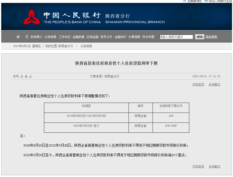 中國人民銀行陜西省分行注明,2019年9月20日至2022年5月29日,陜西全省首套商業(yè)性個人住房貸款利率不得低于相應期限貸款市場報價利率;2022年5月30日至今,陜西全省首套商業(yè)性個人住房貸款利率不得低于相應期限貸款市場報價利率減20個基點。