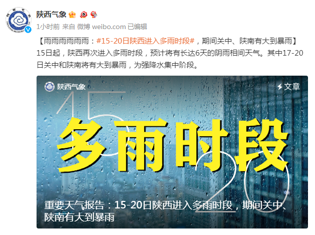 15-20日我省進入多雨時段,17-20日關(guān)中、陜南有大到暴雨
