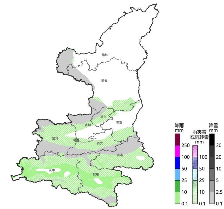 02月28日20時-02月29日20時:全省陰天,陜北南部、關(guān)中大部、商洛及秦巴山區(qū)有小雪或雨夾雪(0.1-3.0mm);漢中、安康有小雨或雨夾雪(0.1-2.0mm),陜北北部有4級左右偏北風,日平均氣溫陜北北部下降4℃左右。