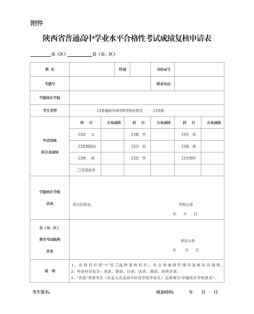 附件:陜西省普通高中學業(yè)水平合格性考試成績復核申請表