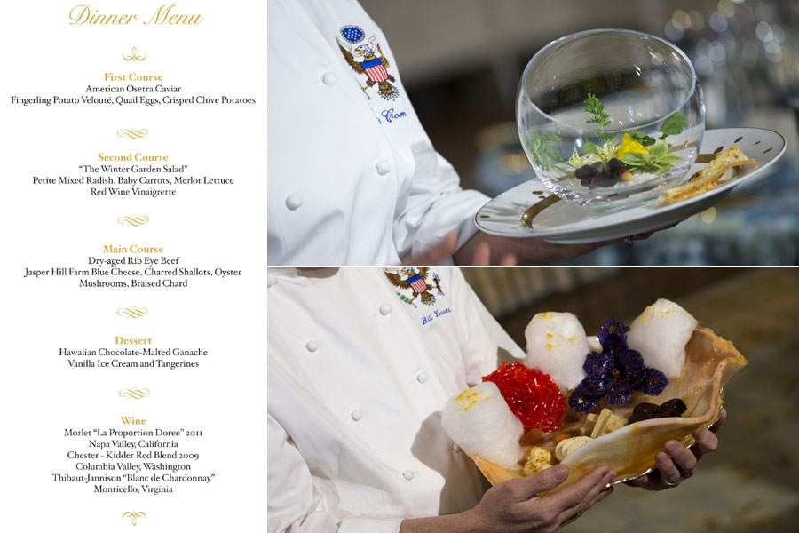 此次宴會(huì)在白宮花園舉行,共有4道菜肴。第一道菜是來自美國(guó)伊利諾伊州河口的奧西特拉魚子醬,配上來自賓夕法尼亞州的鵪鶉蛋,以及來自紐約州、愛達(dá)荷州以及加州農(nóng)場(chǎng)的數(shù)十種馬鈴薯。