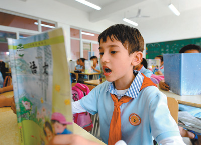 圖為9月13日,在安徽省合肥市蚌埠路第二小學,德國籍小學生正在用普通話朗讀課文。VuX安康新聞網