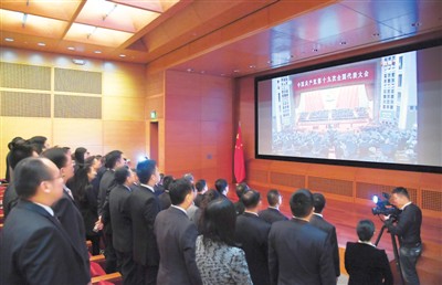 | 圖為當(dāng)?shù)貢r(shí)間10月17日晚,中國(guó)駐美國(guó)大使館全館人員在館內(nèi)放映廳屏幕前觀看十九大開幕式。 |