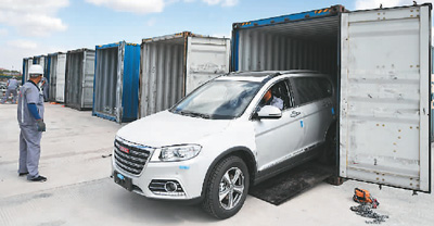 | 6月9日,在吉林省長(zhǎng)春國際陸港,工人將車輛裝入貨柜。 |