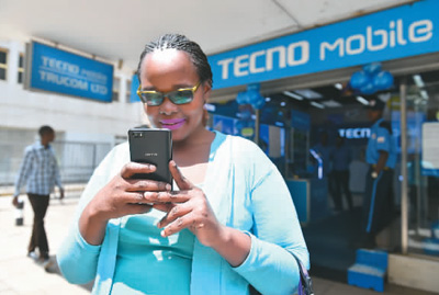 | 5月9日,在肯尼亞首都內(nèi)羅畢市中心,一名當(dāng)?shù)赜脩粽谑褂弥袊放剖謾C(jī)。 |