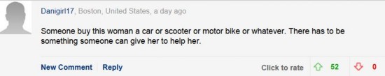 美國波士頓的網(wǎng)友danigiri17寫道:“誰來給她買輛車,或者至少買個小摩托車之類的?隙ㄓ腥四軌驇椭!