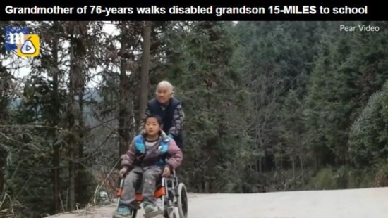 英國《每日郵報》1月22日發(fā)表文章,關(guān)注中國廣西76歲老太史玉英的感人故事。老人每天都會步行24公里的路,用一把破舊的輪椅推著患腦癱的孫子上學(xué)。報道稱,她“4年如一日,風(fēng)雨無阻,意志堅強!
