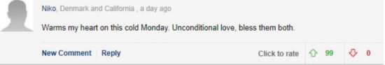 網(wǎng)友Niko:“在這個冰冷的周一,他們之間無條件的愛讓我感覺到了溫暖。祝福他們!