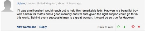 英國倫敦的網(wǎng)友bigben表示:“如果我能再有錢一些的話,我一定會幫助這位偉大的女士的。蔣昊文是個非常聰明的孩子,擅長數(shù)學(xué),過目不忘。他如果能夠有更多的幫助,必定能在世上有所作為。常言說,‘每個成功的男人背后都有個偉大的女人’,昊文背后偉大的女人就是他的奶奶!