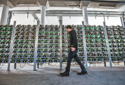 | 1月19日,奧地利伊布斯河畔魏德霍芬附近,一名“礦工”從加密幣“采礦”機組前經(jīng)過。人民視覺 |
