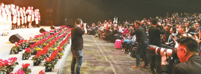 | “親情中華·歡聚巴塞羅那”演出結(jié)束后,演員謝幕,觀眾們?nèi)匀徊簧,臺(tái)上臺(tái)下齊唱《我的祖國(guó)》。本報(bào)記者 孫立極攝 |