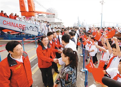 | 2017年10月10日,“雪龍”號圓滿完成第八次北極科考凱旋歸來。圖為科考隊員走下懸梯與前來迎接的人握手。 |