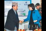圖為1月12日,中國駐尼泊爾大使于紅(右)與尼信息與通信部部長莫漢(左)在中尼跨境陸地光纜開通儀式上握手!