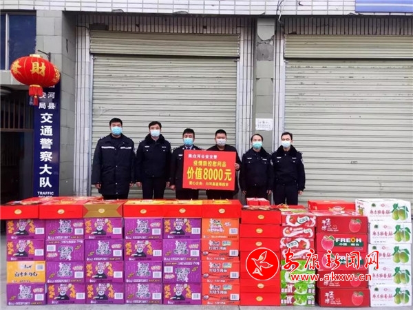 “看到你們公安交警為防控疫情,不畏寒冷,辛苦的工作我非常感動,作為一名共產(chǎn)黨員、一個企業(yè)家、一個公民,我也有義務盡一份社會責任。”2月8日下午,白河縣蠻哥南嶺子大眾超市將價值8000余元的水果、面包、牛奶等物資送到白河縣公安局交警大隊,用濃濃的真誠厚意慰問戰(zhàn)斗在防控一線的公安干警。