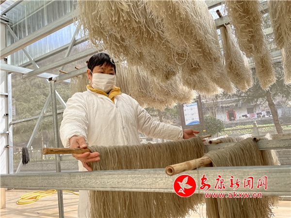 伴著明媚的春光,走進焦贊村的招牌企業(yè)--白河縣希望農產品加工合作社,一桿桿紅薯粉條正在懸掛、晾曬、消凍。生產車間內熱氣騰騰,六七名工人組成一條生產線,經過打芡、撈粉、晾粉等多道工序,金燦燦的紅薯粉條便成型了。憑借著質量過硬、口碑好,合作社生產的紅薯粉條和洋芋粉在市場上很走俏,并與西安電子科技大學和縣內外學校企業(yè)達成了長期供貨協議。