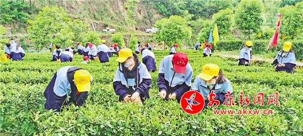 白河縣中廠初級中學(xué)學(xué)生在茅坪鎮(zhèn)五峰生態(tài)茶園采茶研學(xué)。 羅偉 攝