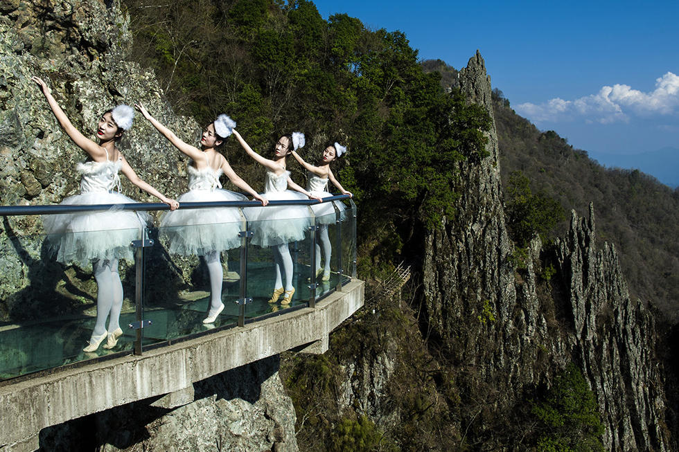 在懸崖絕壁的玻璃棧道上,芭蕾演員們身著潔白的芭蕾服,腳踩透明玻璃,隨著音樂的響起,她們跳出各種唯美的芭蕾舞動(dòng)作。美麗險(xiǎn)峻的山峰,輕巧婀娜的舞姿,將空中芭蕾與山的險(xiǎn)奇有機(jī)結(jié)合,給春天里的南宮山再添了幾分美景。達(dá)人們紛紛走到玻璃棧道,用手中的相機(jī)留念拍照,與粉絲們暢談著 “空中漫步”,低頭俯瞰綿延山川的絕色美景。