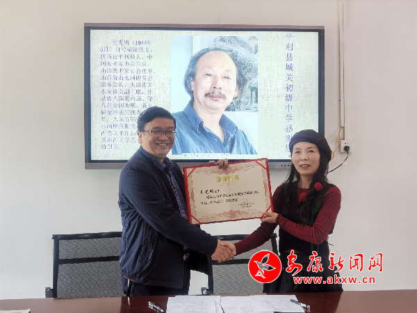 本網(wǎng)訊(通訊員 黃燕)3月18日,平利縣城關初級中學舉辦“中國畫壇百杰、平利籍畫家吳光明”書畫作品捐贈儀式。吳光明委托其外甥女王小茜將《黃河的傳說》《天柱地軸》《恒山深處多仙家》等11幅作品捐給城關初級中學。