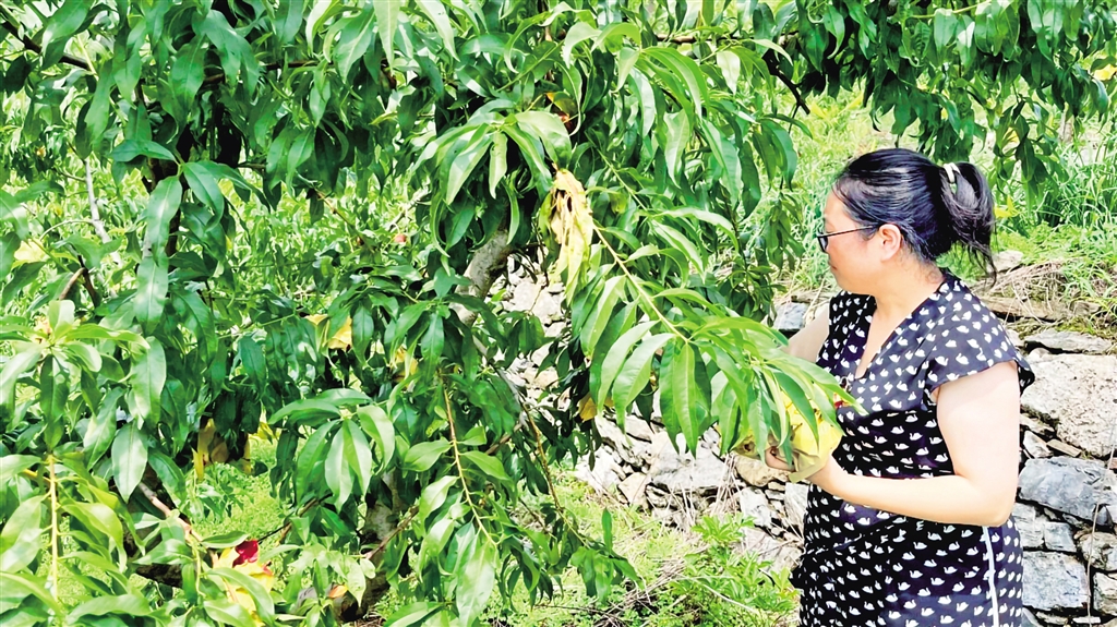 穿過村莊,山坡上500畝桃園綠意盎然。基地負責人伍娟與工人正采摘套袋。“2017年建設的桃園,今年雖受旱情影響,產(chǎn)量仍達30萬斤,產(chǎn)值約300萬元。”