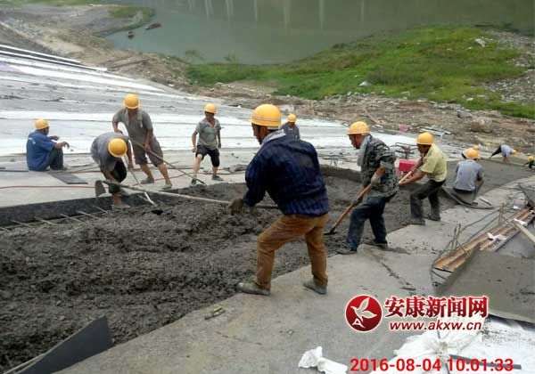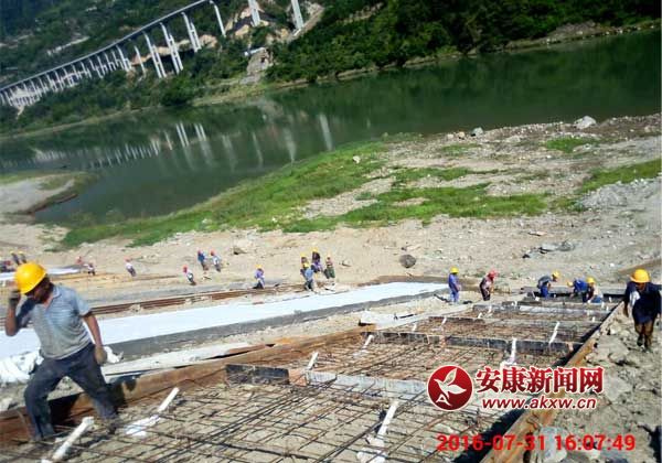 晏溝料場是旬陽水電站工程建設(shè)砂石料篩分基地,近30余萬方的渣土堆砌在漢江右岸,正值漢江主汛期,一旦遭遇漢江洪水,后果不堪設(shè)想,解決料場的防洪安全是保障水電站工程建設(shè)的關(guān)鍵。當?shù)卣徒ㄔO(shè)單位精心組織,拼搶施工,重點對臨江200余米長、40余米高的料場截面采用混泥土面板防護工程措施,經(jīng)過一周時間的連續(xù)奮戰(zhàn),提前4天順利完成江岸料場防護工程節(jié)點任務(wù)。