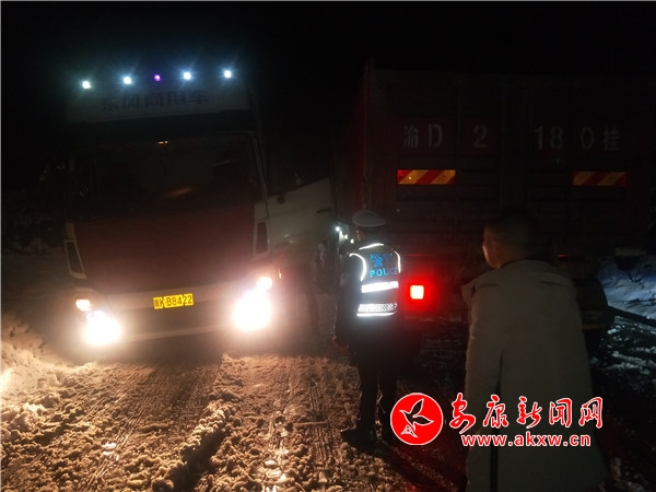 1月6日至8日鎮(zhèn)坪持續(xù)大到暴雪天氣,雞心嶺路段因海拔較高,積雪結(jié)冰嚴(yán)重,導(dǎo)致30余輛大型貨車滯留。鎮(zhèn)坪交警及時(shí)上山疏導(dǎo)交通,對(duì)發(fā)生緊急情況的車輛進(jìn)行救援,并對(duì)未采取防滑措施的車輛進(jìn)行勸返,截至1月8日上午11時(shí)交警仍然在該路段進(jìn)行救援工作。(圖文/趙榮鵬)JxD安康新聞網(wǎng)