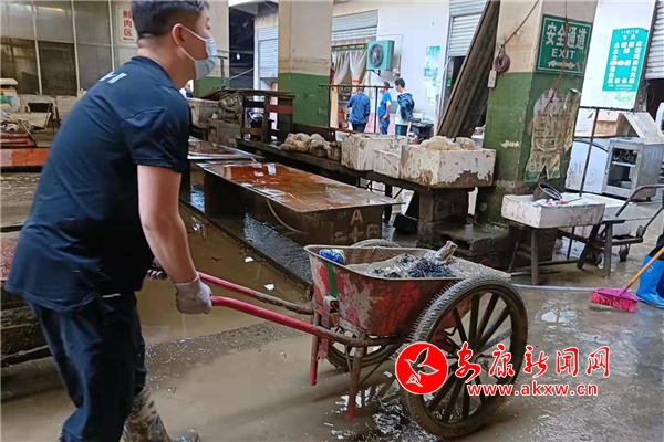 在自救的同時,9月20日起,縣市場監(jiān)管局的干部們同步投入到重災區(qū)農(nóng)貿(mào)市場的清淤工作中。在此次災情中,農(nóng)貿(mào)市場受災最為嚴重,各類設施受損嚴重,垃圾污泥成片,污水橫流,一片狼藉,完全不能投入使用。在農(nóng)貿(mào)市場,大家自帶工具集中投入到這場農(nóng)貿(mào)市場“美容戰(zhàn)”中,加緊清理淤泥、疏通水渠、打掃地面。 淤泥太厚了,他們就用刮板推;水渠堵了,他們就用手去疏通;地面太臟了,他們就用沖水管去沖;污泥流不出去,他們就用小推車一車一車地運.......面對受災的商戶,干部們認真做好安撫,鼓勵經(jīng)營戶重拾信心,重建美麗家園。