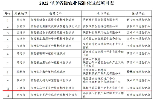 本網(wǎng)訊(通訊員 李東昇 李秦鄂)10月24日,陜西省市場(chǎng)監(jiān)管局發(fā)布了2022年度省級(jí)農(nóng)業(yè)標(biāo)準(zhǔn)化試點(diǎn)項(xiàng)目,由鎮(zhèn)坪縣市場(chǎng)監(jiān)管局推薦,鎮(zhèn)坪縣馬鈴薯產(chǎn)業(yè)發(fā)展有限公司承擔(dān)的馬鈴薯良種繁育標(biāo)準(zhǔn)化試點(diǎn)項(xiàng)目榜上有名。據(jù)悉,此次全省獲批的項(xiàng)目?jī)H有11個(gè)。該項(xiàng)目也是安康市2022年度唯一一個(gè)省級(jí)農(nóng)業(yè)標(biāo)準(zhǔn)化試點(diǎn)項(xiàng)目。