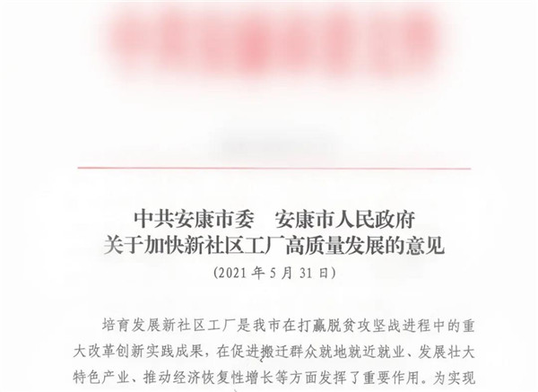 近年來,我曾多次強調(diào)發(fā)展新社區(qū)工廠的重要意義。在去年9月20日新社區(qū)工廠發(fā)展推進會上,我講了“新社區(qū)工廠是促進經(jīng)濟恢復(fù)性增長和鞏固脫貧攻堅成果的最佳結(jié)合點”;在去年11月接受《民生周刊》記者專訪時,我講到“推動安康新社區(qū)工廠發(fā)展絕不是一件小事,而是關(guān)乎民生福祉和社會和諧的頭等大事”“現(xiàn)在是‘一把手’工程,今后也應(yīng)該是‘一把手’工程”。